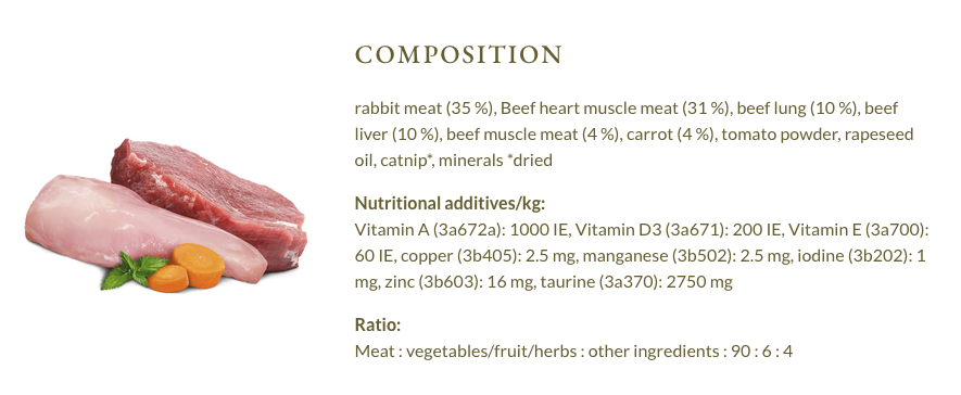 Ingrediëntenlijsten die beginnen waar ze horen te beginnen: “konijnenvlees (35%)”, “runderspierhart (31%)”, “runderlong (10%)”, “runderlever (10%)”, “rund spiervlees (4%)” .