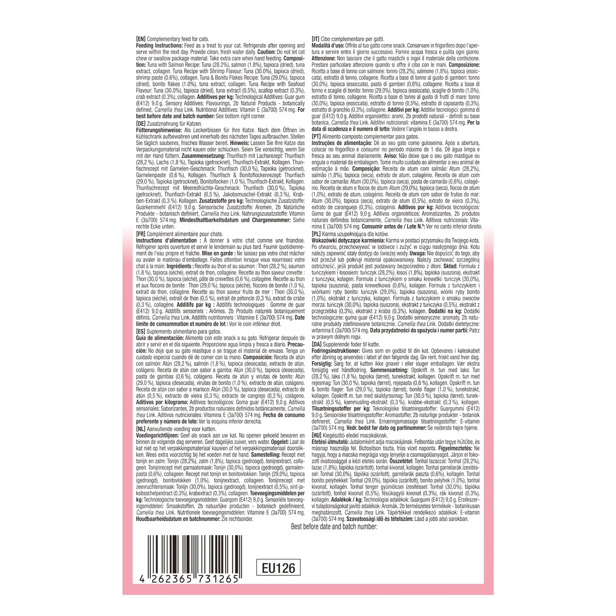 - 5x Tonijn met Zeevruchten recept: Tonijn (30.0%), tapioca (gedroogd ), tonijn extract (0.5%), St. Jacobsvrucht extract (0.3%), krab extract (0.3%), collageen.