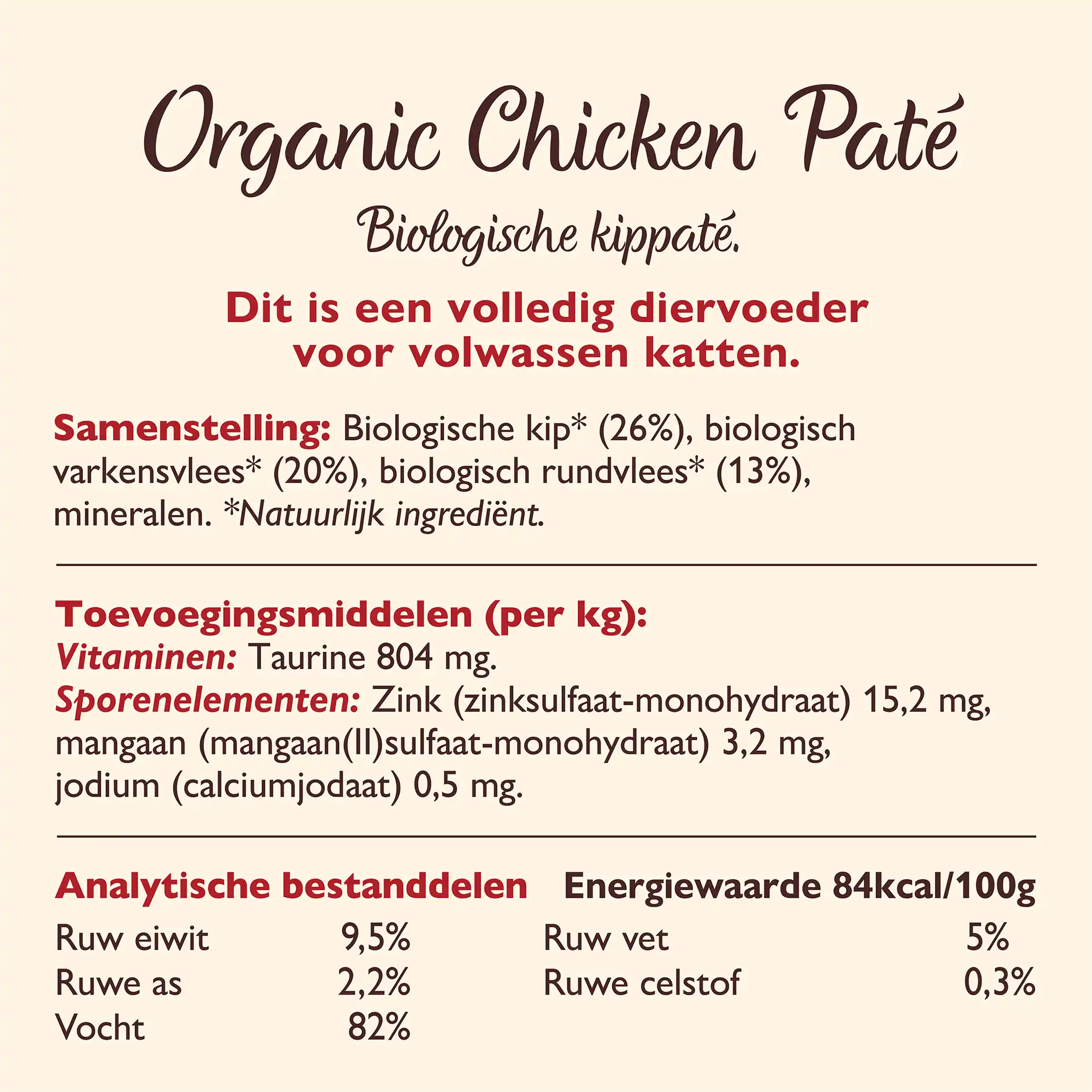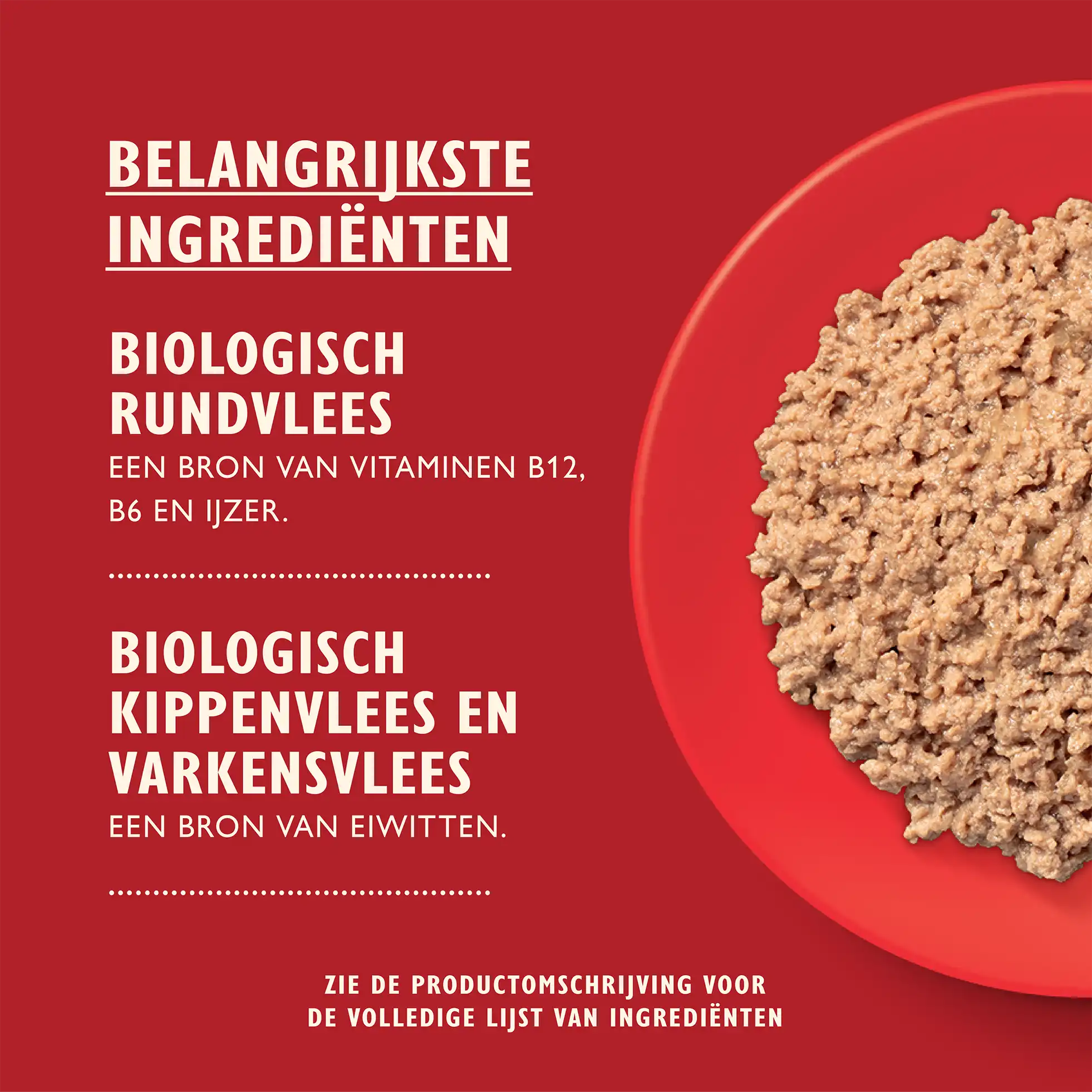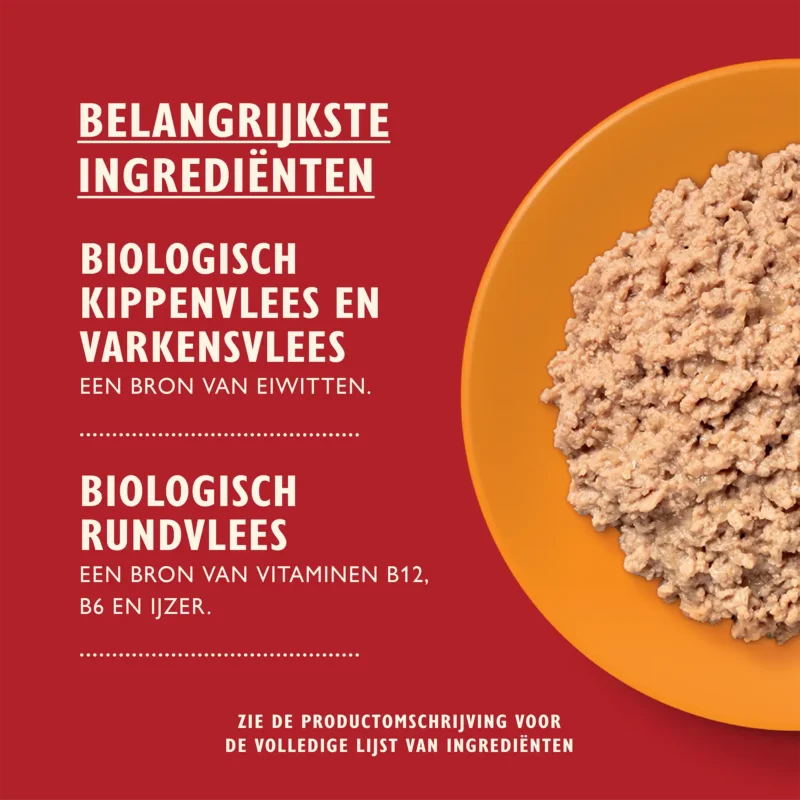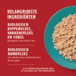 Biologisch rund (26%), biologische kip (20%), biologisch varken (10%), mineralen.