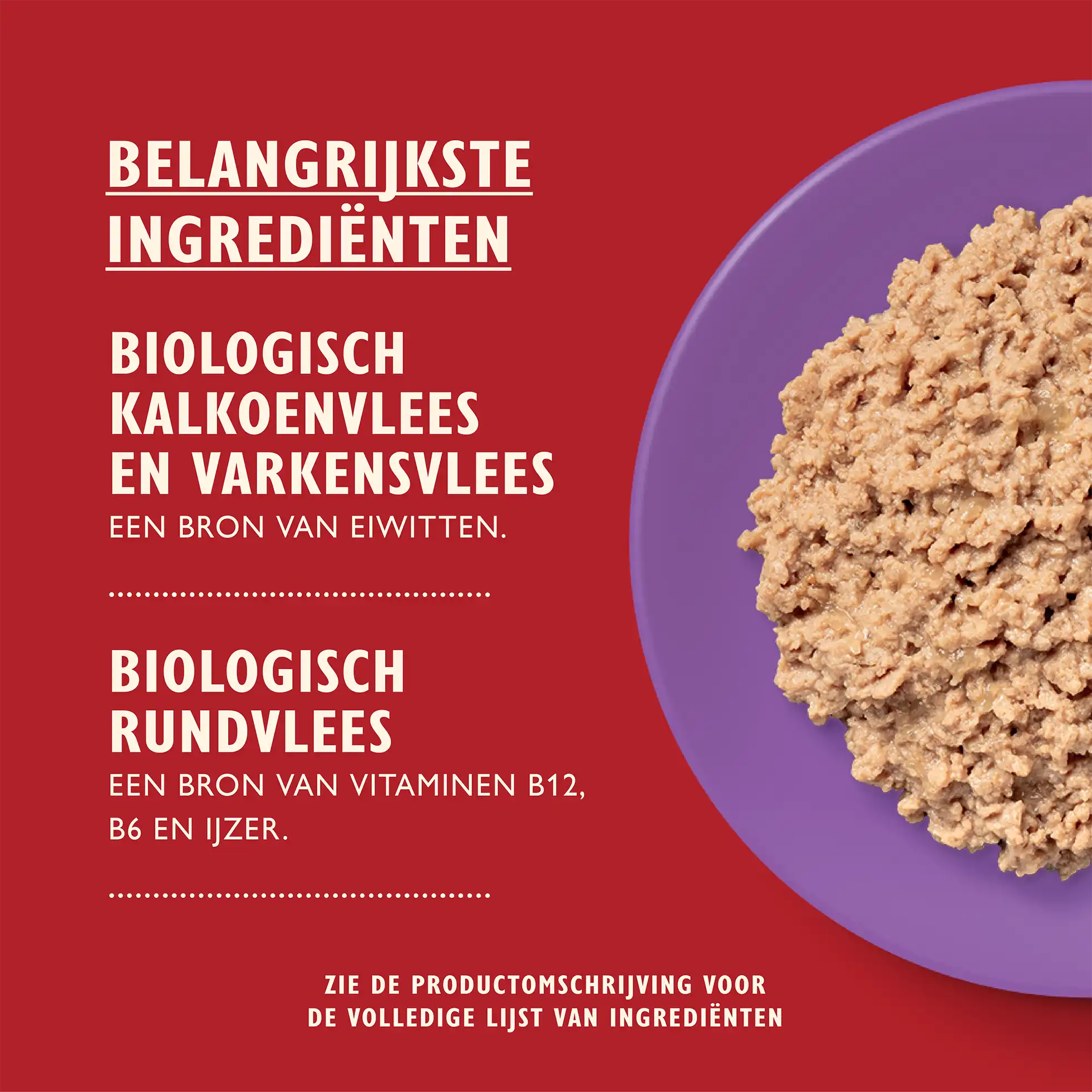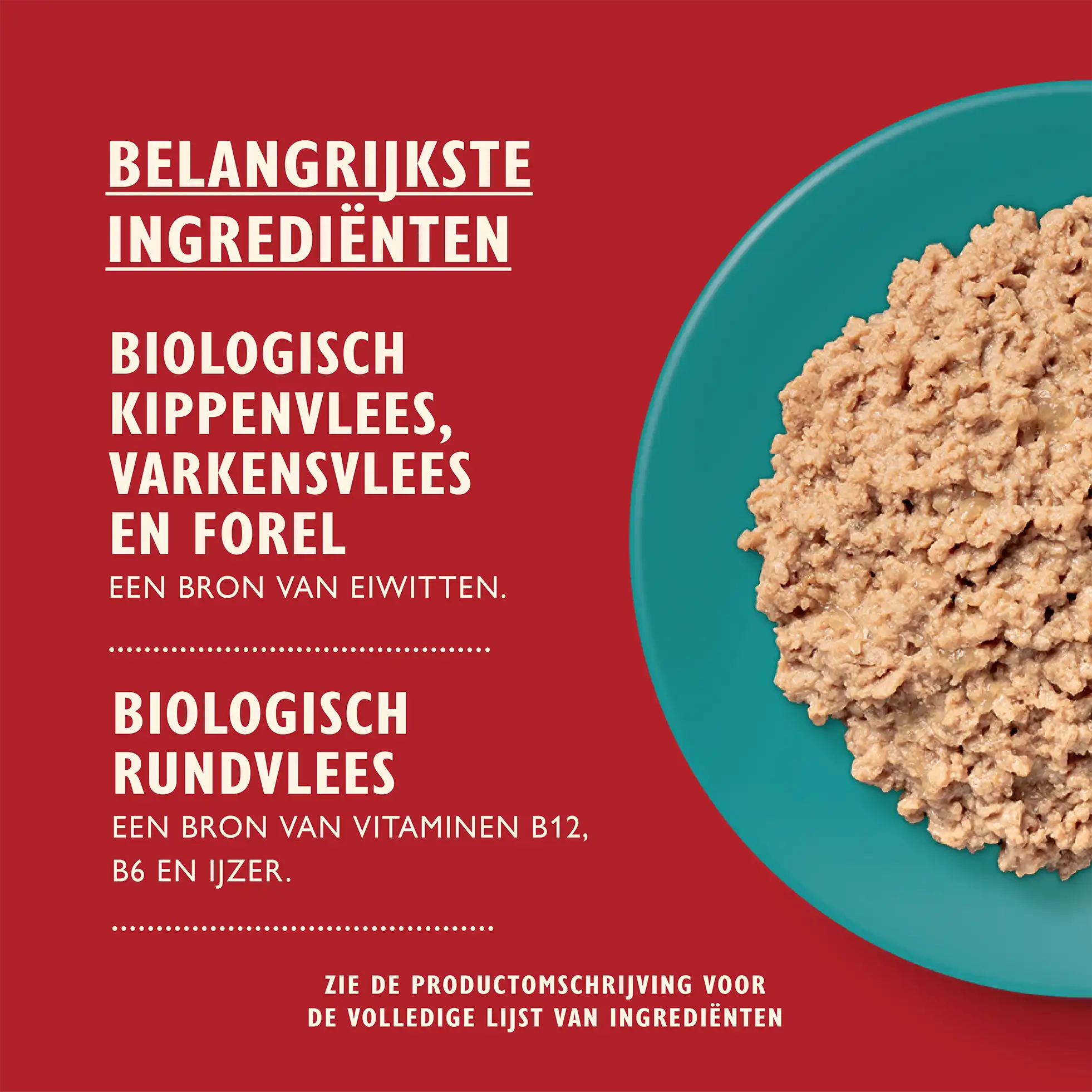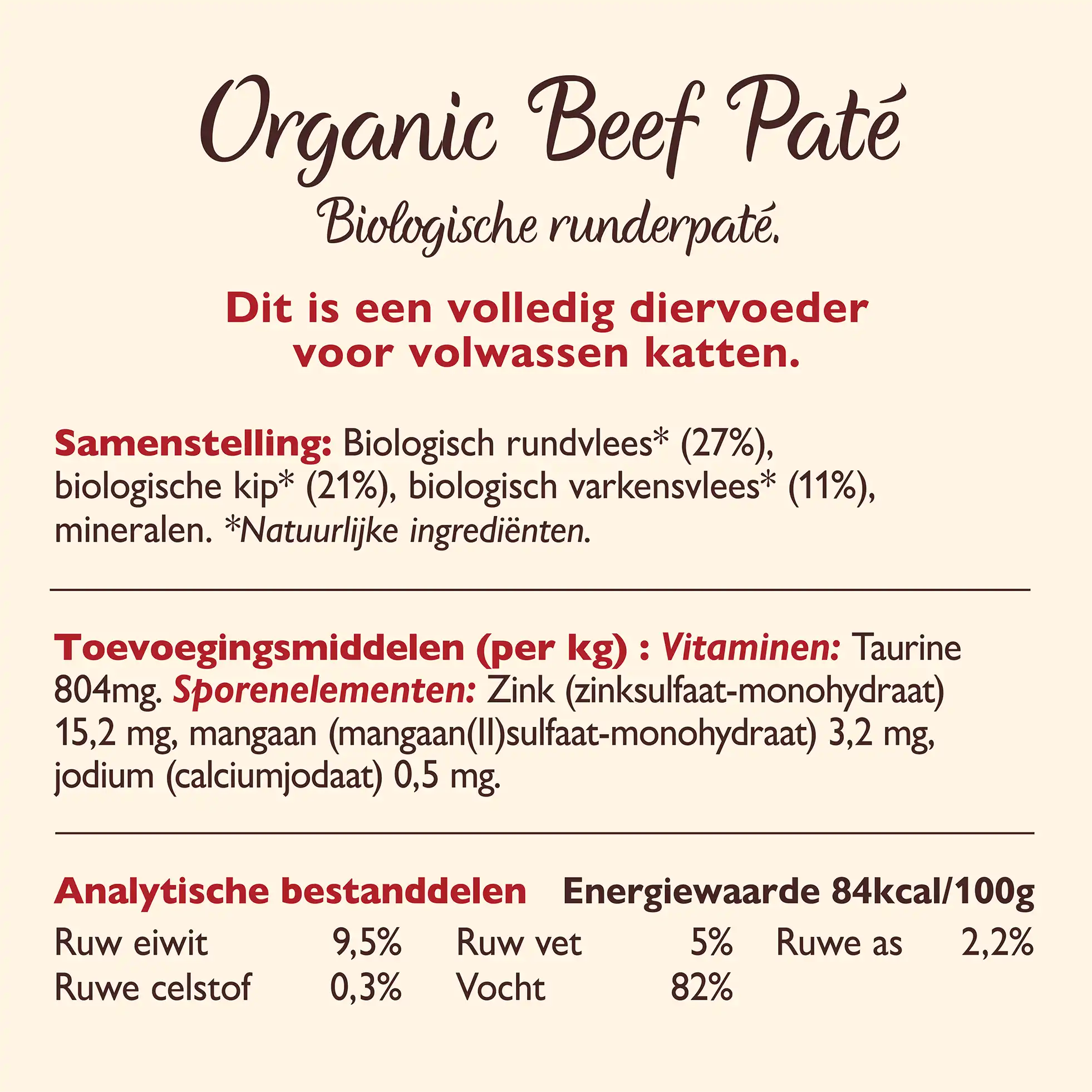 Biologisch rund (26%), biologische kip (20%), biologisch varken (10%), mineralen.