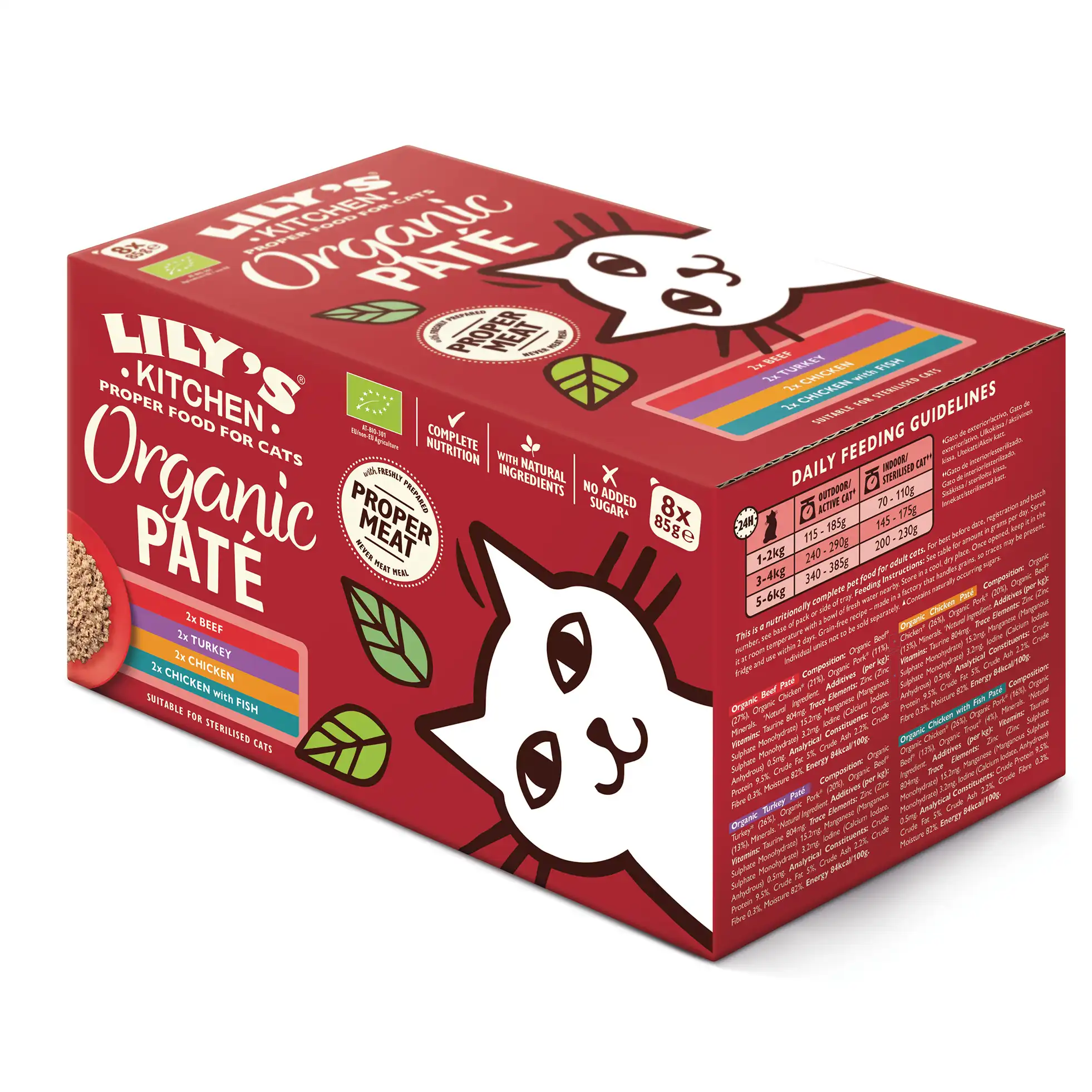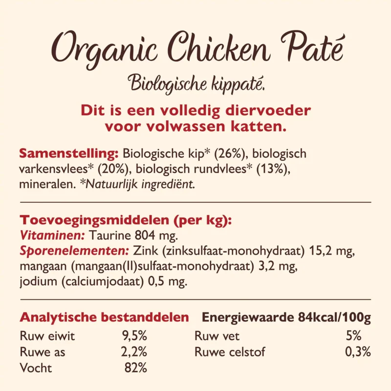 Elk recept is samengesteld met gecertificeerde biologische ingrediënten, waaronder kwaliteitsvlees, orgaanvlees en vis. De smeuïge patétextuur maakt het voer extra aantrekkelijk, zelfs voor de meest veeleisende fijnproevers. Doordat de recepten compleet en gebalanceerd zijn, krijgt je kat alle voedingsstoffen die nodig zijn voor een gezond en vitaal leven.