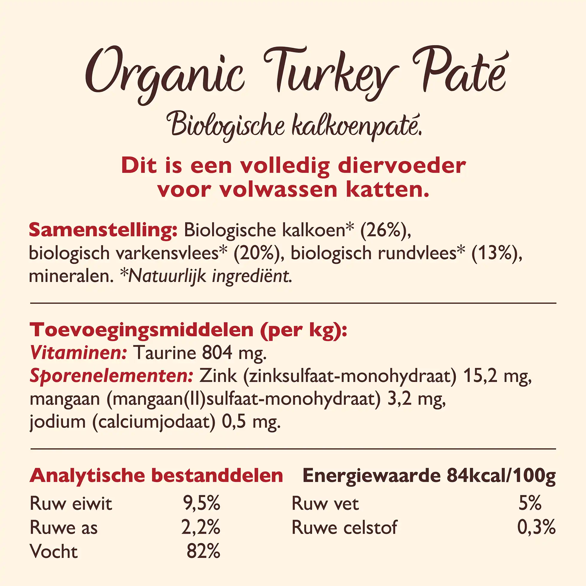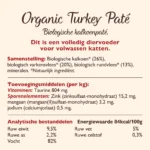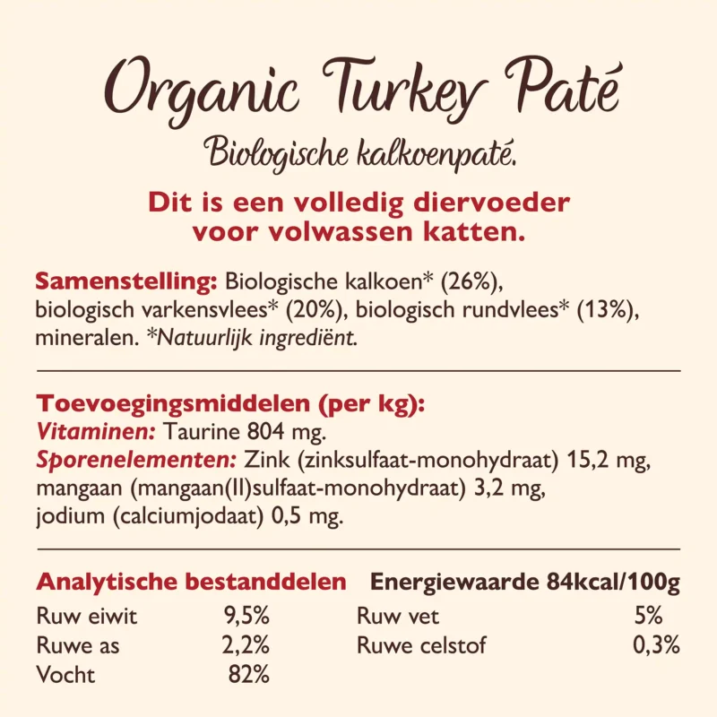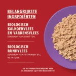 Biologische kalkoen (26%), biologisch varken (12%), biologisch rund (10%), biologische vis (4%), biologische kip (4%), biologische wortels, mineralen.