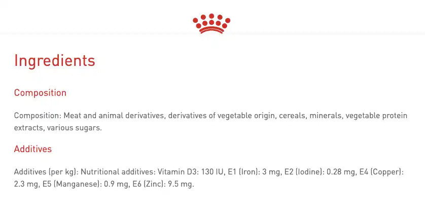 Screenshot van de ingrediëntenlijst op de Royal Canin website op 7/10/25: