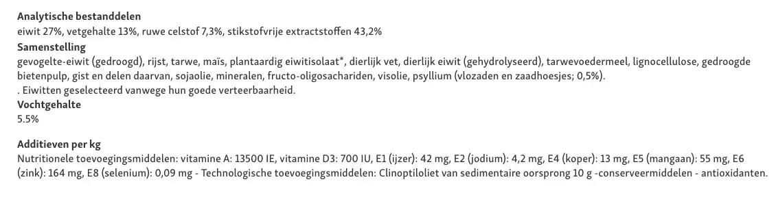 Analyse: Het eerste ingrediënt is geen vers vlees, maar een ongespecificeerd gevogelte eiwit. Nog belangrijker: de drie daaropvolgende ingrediënten zijn rijst en drie graansoorten. Dit betekent dat het product voor een zeer groot deel uit koolhydraten bestaat – exact wat jouw kat biologisch niet nodig heeft. Ter vergelijking: de natuurlijke prooi van een kat bevat slechts 3-8% koolhydraten.