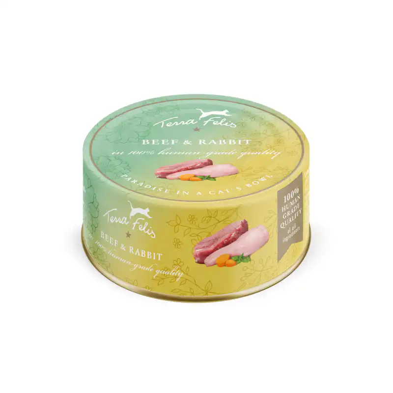 Katten zijn geboren jagers die in de natuur konijnen en andere prooien zouden vangen. Terra Felis Rund & Konijn brengt deze natuurlijke voeding terug naar het voerbakje. Met maar konijn als basis en voedzaam rund als aanvulling krijgt je kat precies wat de natuur bedoeld heeft. Geproduceerd nabij München volgens strikte Duitse kwaliteitsnormen.