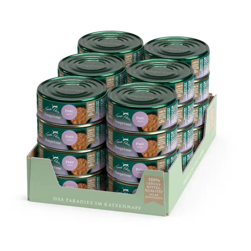 Kalkoen is de vetarme optie uit de gourmetsoep collectie – rijk aan eiwit maar laag in vet. Terra Felis Souprème Kalkoen combineert vers kalkoenhart met een fluweelzachte bouillon voor een smaakvolle maar lichte maaltijd. Perfect voor katten die op gewicht moeten letten of voor oudere katten die een lichter verteerbare optie nodig hebben. Ontwikkeld door dierenartsen en geproduceerd nabij München volgens strikte Duitse kwaliteitsnormen.